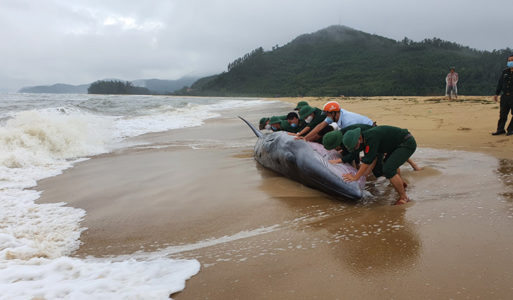 Sáng 18/10, một con cá voi lớn dạt vào bờ tại khu vực cửa biển Tư Hiền, xã Vinh Hiền, huyện Phú Lộc, tỉnh Thừa Thiên – Huế. Cán bộ chiến sĩ Biên phòng và người dân địa phương đã nỗ lực đưa cá voi về với môi trường biển.