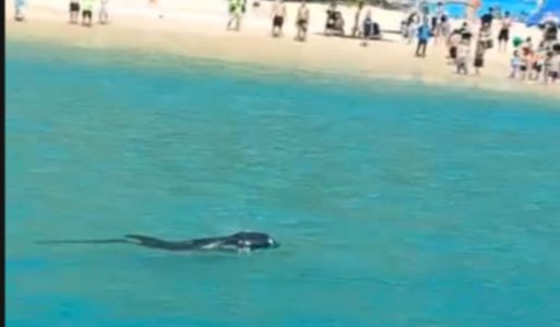 (TSVN) – Một con cá heo dài khoảng 1,6 m, ước nặng hơn 100 kg xuất hiện tại vùng biển gần bờ khu du lịch Kỳ Co, xã Nhơn Lý, thành phố Quy Nhơn, tỉnh Bình Định làm du khách bất ngờ, thích thú.
