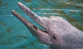 Con cá heo ở công viên thủy cung Singapore có màu hồng do mắc một dạng ung thư da, tuy nhiên nó vẫn biểu diễn trước khách tham quan.