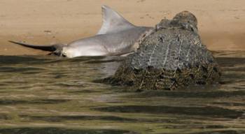 Một khách du lịch người Anh vừa chụp được khoảnh khắc một con cá sấu đang ngoạm một con cá mập bò tại vùng lãnh thổ Bắc Australia.