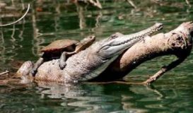 Một chú rùa dũng cảm đã leo lên lưng cá sấu nước ngọt để phơi nắng ở con sông Barron (bang Queensland, Australia) – nơi tràn ngập loài động vật ăn thịt này.
