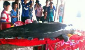 Sáng 26/8, trong lúc đi thăm dây ốc (dụng cụ đánh bắt mực) trên vùng biển Phú Quốc (Kiên Giang), ông Mai Văn Dũng (ngụ xã Hòn Nghệ, huyện Kiên Lương) phát hiện một con cá heo vướng dây chết nên đưa vào khu vực bãi Khem, thị trấn An Thới, huyện Phú Quốc.