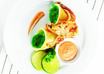Vị dẻo thơm và màu sắc lạ của cốm xanh khiến món mực nhồi trở nên rất độc đáo và ngon lành.