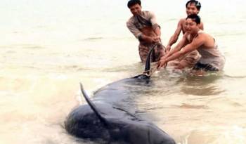 Trong lúc thả lưới đánh cá trên biển một số ngư dân phát hiện một con cá voi gần 1 tấn mắt vào lưới.