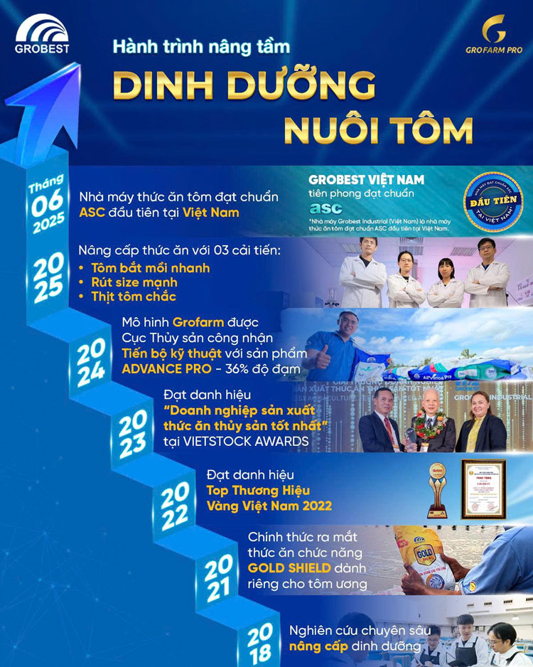 Không chỉ tập trung cải tiến công thức dinh dưỡng, Grobest còn thúc đẩy các giải pháp nuôi hiệu quả và an toàn sinh học, giảm phụ thuộc vào kháng sinh trong chuỗi sản xuất. Từ năm 2018, Grobest nâng cấp công thức dinh dưỡng và liên tục khẳng định cam kết đổi mới qua loạt dấu ấn: Top Thương hiệu Vàng Việt Nam 2022, Doanh nghiệp sản xuất thức ăn thủy sản tốt nhất tại Vietstock Awards 2023, Grofarm – mô hình nuôi tôm công nghệ cao cùng sản phẩm ADVANCE PRO được công nhận là tiến bộ kỹ thuật năm 2024.