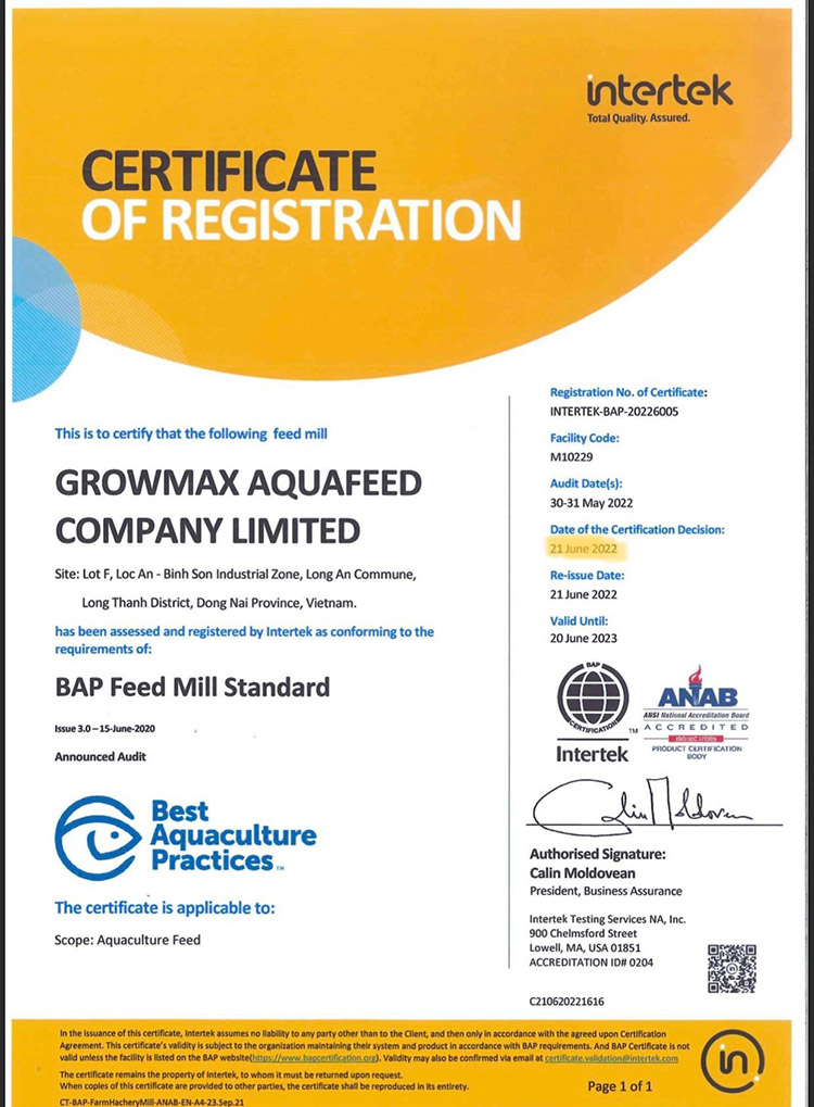 (TSVN) – Ngày 21/6/2022, Tổ chức cấp chứng nhận thủy sản Global Trust đã trao Chứng nhận Tiêu chuẩn thực hành nuôi trồng thủy sản tốt nhất (Best Aquaculture Practices – BAP) của Liên minh Nuôi trồng thủy sản toàn cầu (GAA) cho Nhà máy sản xuất thức ăn thủy sản của Công ty TNHH Thức ăn Thủy sản GrowMax. Chứng nhận BAP được xem là một loại “tem” đảm bảo uy tín, chất lượng cho các sản phẩm được tiêu thụ tại các thị trường khó tính nhất như Nhật Bản, Mỹ và châu Âu.