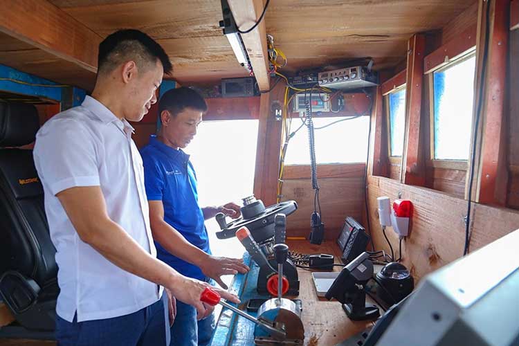 Cán bộ chuyên môn Chi cục Thủy sản tỉnh kiểm tra các thiết bị trên tàu cá.