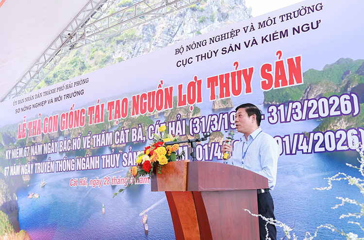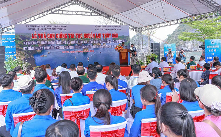 Phát biểu tại buổi lễ, ông Nguyễn Quang Hùng, Phó Cục trưởng Cục Thủy sản và Kiểm ngư nhấn mạnh, sự kiện được tổ chức tại vùng biển Cát Bà mang ý nghĩa đặc biệt, gắn với dấu mốc lịch sử 67 năm Ngày Bác Hồ về thăm Cát Bà, Cát Hải và Ngày truyền thống ngành Thủy sản Việt Nam.