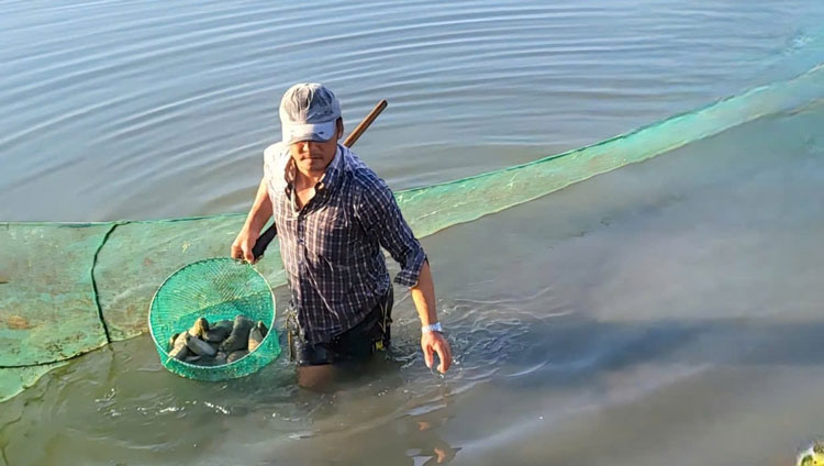 Hộ nuôi ở phường Sông Cầu, tỉnh Đắk Lắk thu hoạch hải sâm cát. Ảnh: Kim Sơ.