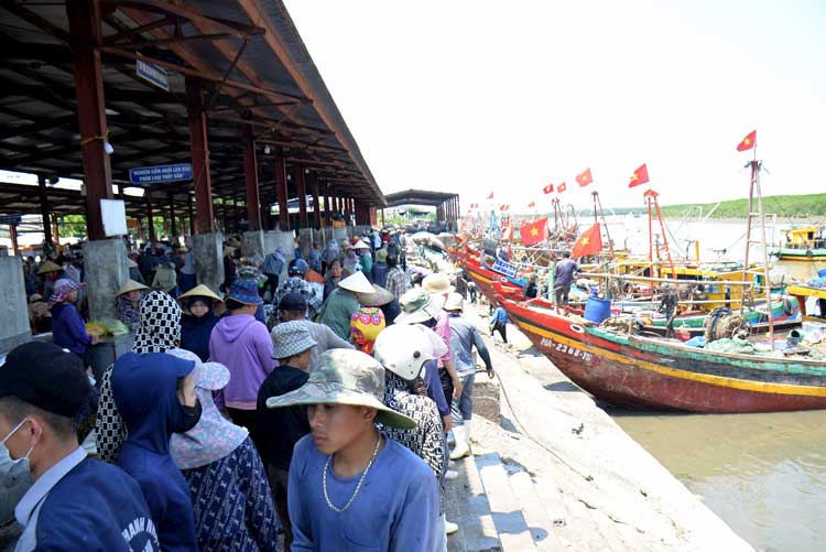 Từ khoảng 12 giờ trưa đến đầu giờ chiều, khi sông Lạch Vạn dâng lên theo con nước, từng con thuyền nối đuôi nhau cập bến trong niềm phấn khởi của ngư dân. Những mẻ cá, mực, tôm, ghẹ tươi rói, thậm chí nhiều loại còn đang sống, vừa đưa từ khoang thuyền lên bến đã lập tức được thương lái và khách du lịch tranh nhau thu mua.