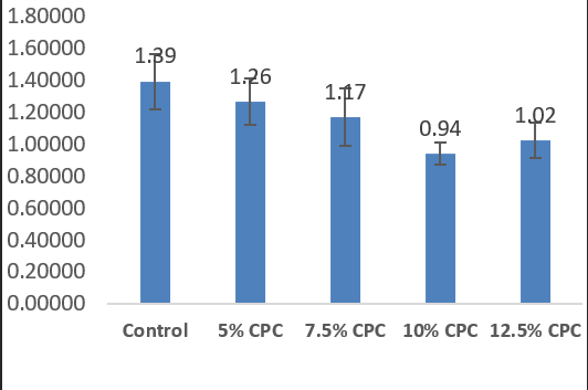 Kết quả tử thí nghiệm cá giống (Bảng 2) cho thấy cá từ các nghiệm thức 5% CPC, 7.5% CPC, 10%, CPC và 12.5% CPC có trọng lượng trung bình, sinh khối thu hoạch và % tăng trọng cao hơn và khác biệt ý nghĩa thống kê (P< 0.05) so với cá từ lô đối chứng bột cá (Control) và liều lượng tối ưu CPC là 10%. Hệ số chuyển đổi thức ăn khác biệt không ý nghĩa (P> 0.05) khi so sánh lô đối chứng với 5% CPC và 7.5% CPC nhưng khác biệt thấp ý nghĩa của 10% CPC và 12.5% CPC so với đối chứng (P< 0.05) (Bảng 2). Ngoài ra, chi phí thức ăn trên kg cá tăng trọng cũng ghi nhận thấp nhất ở liều lượng 10% Empyreal 75 so với các nghiệm thức đối chứng &các nghiệm thức CPC khác (Hình 1).