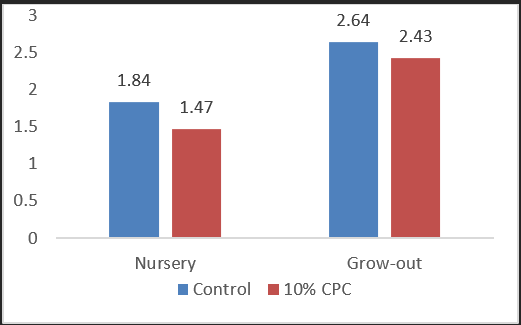 Kết quả thí nghiệm ở giai đoạn cá hương và cá thịt nuôi lồng bè cũng cho thấy 10% CPC thay thế bột cá trong thức ăn đối chứng thương mại cho kết quả vượt trội và cao hơn với khác biệt có nghĩa thống kê về sinh khối, trọng lượng thu hoạch, % tăng trọng so với thức ăn đối chứng trong khi hệ số thức ăn thấp khác biệt có ý nghĩa thống kê so với đối chứng (Bảng 3 & 4).