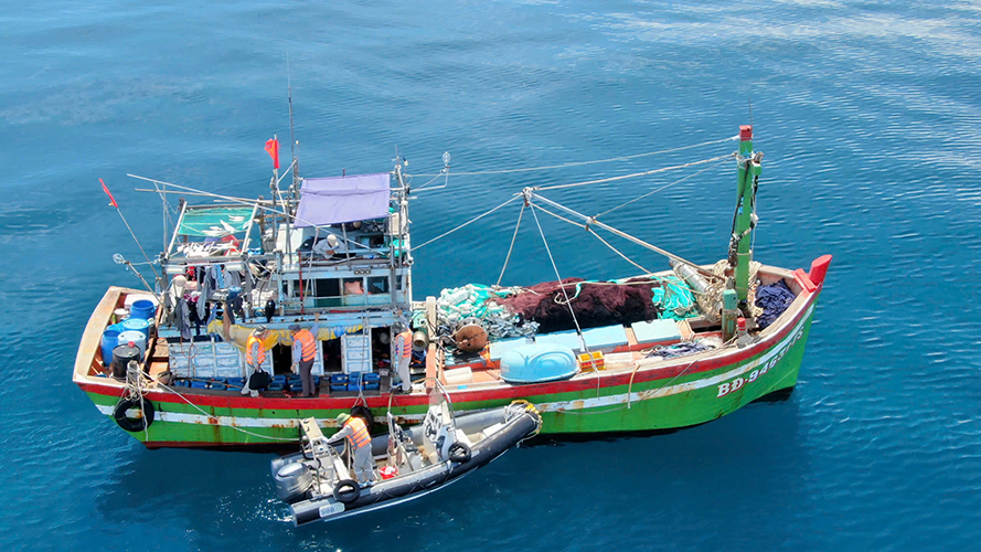 Lực lượng kiểm ngư kết hợp tuần tra, kiểm tra, kiểm soát trên biển, kết hợp hỗ trợ ngư dân khai thác thủy sản. Ảnh: Minh Phương