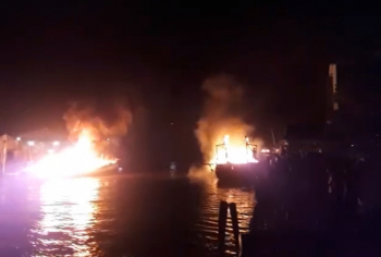 Chiếc tàu cá vừa đổ dầu để chuẩn bị ra khơi thì bỗng dưng bốc cháy dữ dội, đồng thời cháy lan sang 2 tàu cá khác. Vụ cháy tàu cá xảy ra lúc rạng sáng 17/7, tại H.Hòn Đất, Kiên Giang