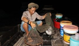 Dù nắng hay mưa, bất kể ngày hay đêm, cứ đến con nước, những người mò cá ngát lại tiếp tục công việc mưu sinh. Họ phải “hụp lặn” tận đáy sông sâu hàng chục mét để bắt những con cá ngát hung tợn đang trú ngụ trong hang.