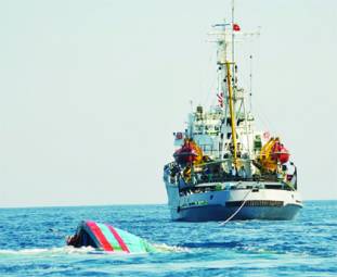 Chiếc tàu cá của ngư dân Đà Nẵng bị tàu Trung Quốc đâm chìm, chỉ nổi lấp lửng như một mảng gỗ trên mặt nước. “Quá đau lòng!” – Ai nấy đều thốt lên và càng phẫn nộ hơn, khi phía Trung Quốc chối bay hành động này.