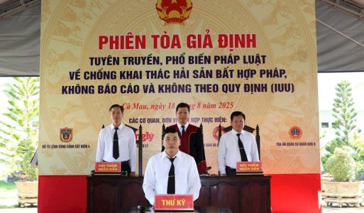 (TSVN) – Sáng 18/8/2025, tại Đồn Biên phòng Gành Hào (xã Gành Hào, tỉnh Cà Mau), Bộ Tư lệnh Vùng Cảnh sát biển 4 (BTL Vùng CSB4) phối hợp với Báo Công lý, Tòa án Quân sự Quân khu 9 tổ chức phiên tòa giả định nhằm tuyên truyền pháp luật về chống khai thác thủy sản IUU (bất hợp pháp, không báo cáo, không theo quy định).