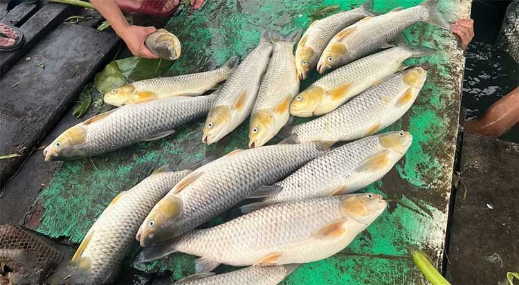 Một số người nuôi cá bè tại đây cho biết, sau trận mưa lớn rạng sáng 29-5, cá trong lồng bè có hiện tượng ngộp thở và chết hàng loạt, đa số là các loại cá rô phi, chép, trê, lăng, mè hỏi, trắm.