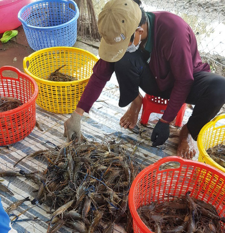 Ông Nguyễn Văn Tuấn đang phân loại tôm càng xanh. Ảnh: TTKNKG