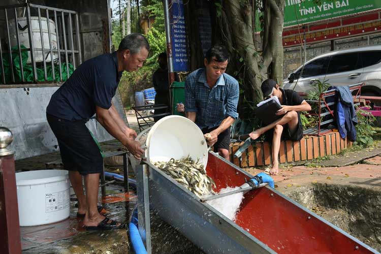 Công nhân Công ty Cổ phần Nuôi trồng và Chế biến Thủy sản Việt Nam thả cá xuống hồ Thác Bà.