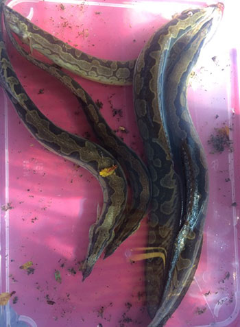 Sau 2 tháng ương và chăm sóc, con cá chạch lấu giống đã lớn, anh tháo mùng lưới cước ra nuôi đại trà trong ao và sử dụng thức ăn viên công nghiệp có nhiều độ đạm, tăng lượng thức ăn lên theo quá trình lớn của cá. Cá chạch lấu nuôi được từ 3 – 4 tháng, anh Trung bắt đầu mua cá heo sông đuôi đỏ của người dân đánh bắt được ngoài tự nhiên thả vào chung một ao nuôi ghép. Cá heo sông đuôi đỏ là loại cá nước ngọt có kích cỡ từ 5 – 8 cm, thân tròn trịa được bao phủ một lớp da dày ánh màu xanh biếc; đuôi và vây có màu đỏ cam; miệng nhỏ – nhọn; gần hai bên miệng có hai ngạnh nhọn cong vút màu trắng.