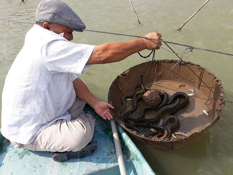 Ông Cang theo dõi đàn cá chạch lấu ghép cá heo sông đuôi đỏ