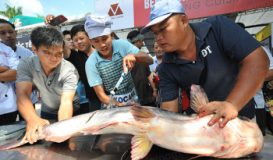 Những con cá tra “khổng lồ”, có trọng lượng 25 – 30 kg/con đang được Công ty Minh Đức Thành, quận Thốt Nốt, TP Cần Thơ xẻ thịt bán với giá 350.000 đồng/kg.