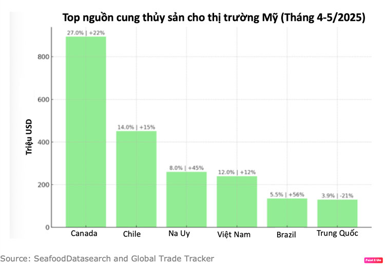Tuy nhiên, thủy sản chỉ chiếm tỷ trọng nhỏ trong cán cân thương mại Mỹ (11% thị phần toàn cầu so với 25% GDP), giúp ngành tránh được sự đứt gãy quy mô lớn như thép hay ô tô. Phần lớn giao dịch vẫn diễn ra ngoài nước Mỹ, với EU, Trung Quốc, Nhật Bản và Na Uy chiếm gần 50% thị trường. Ngoài ra, Mỹ tăng nhập từ các nguồn “an toàn” như Canada (27%, tăng 22% giá trị), Chile (14%) và Na Uy (8%, tăng 45%). Chuỗi cung ứng phục hồi tốt nhưng vẫn dễ tổn thương nếu mối quan hệ Mỹ-Canada xấu đi, đặc quyền thuế quan có thể biến mất.