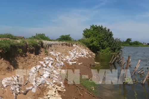 Một số đoạn đê bao ngăn mặn của sông Mai Giang đoạn qua xã Quỳnh Bảng (Quỳnh Lưu, Nghệ An) bị sạt lờ nghiêm trọng. Nếu đê vỡ, nguy cơ mất trắng toàn bộ vùng nuôi tôm sẽ gây thiệt hại hàng trăm tỷ đồng. Ảnh: Nguyễn Oanh – TTXVN
