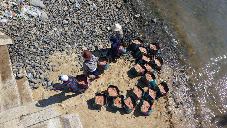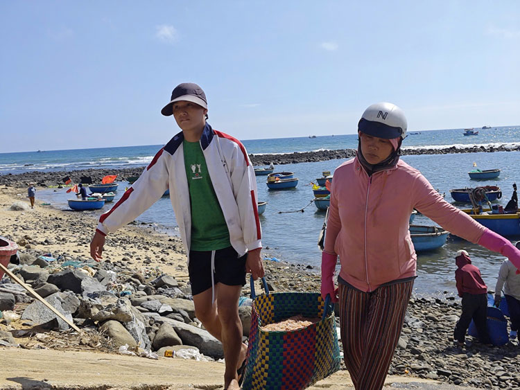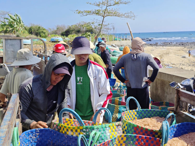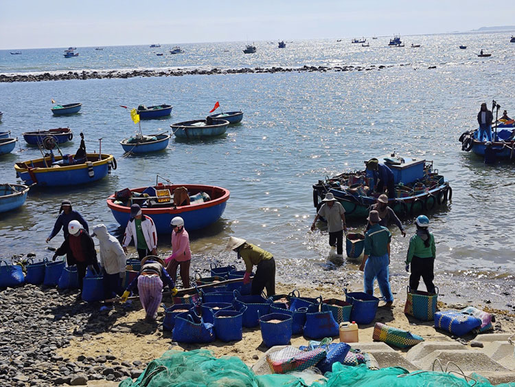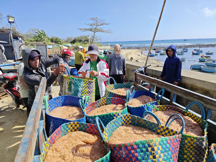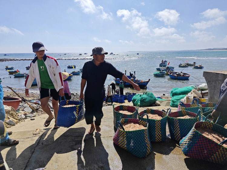 Giữa trưa, mặt biển ven bờ nhộn nhịp hẳn lên khi những chiếc thuyền thúng chai len lỏi giữa các tàu đánh bắt để thu mua ruốc ngay trên biển. Từng mẻ ruốc tươi được chuyển nhanh sang thúng, rồi đưa vào bờ. Tại bãi, ruốc được đổ vào những giỏ lớn hoặc khay nhựa, cân bán ngay cho thương lái đang chờ sẵn.