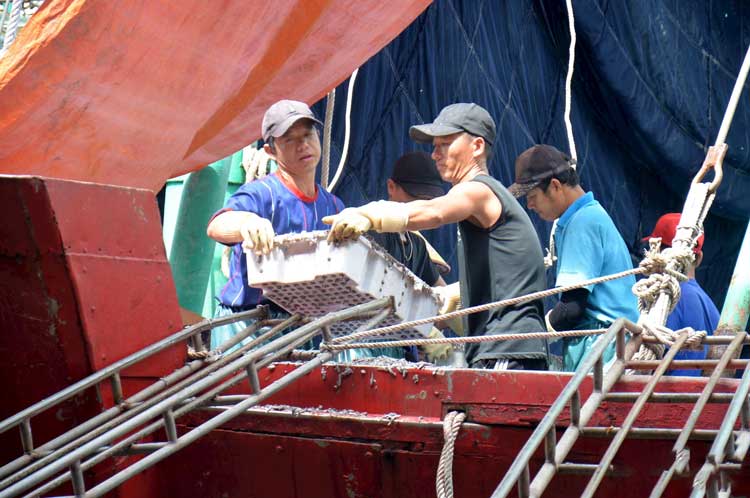 Người dân bốc dỡ hải sản tại Cảng cá Lạch Quèn. Ảnh: Xuân Hoàng