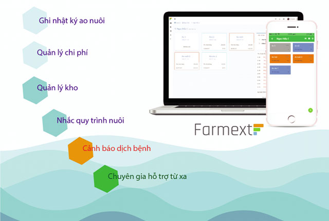 Cùng đó là “Farmerxt” – ứng dụng được thiết kế từ thực tế quản lý nuôi tôm cá ở Việt Nam. Ứng dụng không những giúp người nuôi ghi nhật ký ao nuôi dễ dàng mà còn nhắc nhở một số việc cần làm theo đúng quy trình nuôi và gợi ý giải quyết các vấn đề về kỹ thuật. Số liệu của ao nuôi sẽ được thống kê bằng những biểu đồ trực quan giúp người nuôi ra quyết định hoặc chia sẻ chúng cho các chuyên gia kỹ thuật để họ hỗ trợ từ xa. Ngoài ra, “Farmext” còn có rất nhiều tính năng quản lý như: quản lý kho, quản lý thu chi, phân quyền quản lý… Đây thực sự là những công cụ hữu ích cho người nuôi thủy sản.