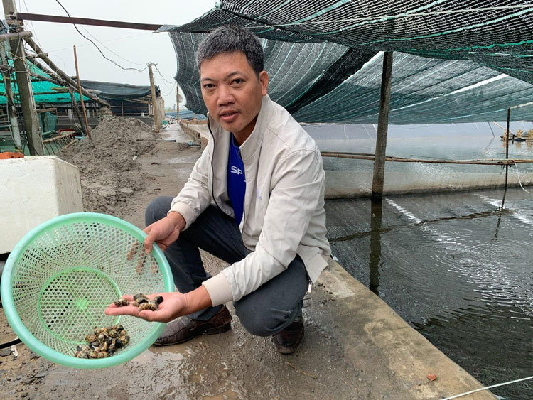 Bên cạnh việc duy trì nuôi các loại cá nước mặn, nước lợ đặc sản và chế biến sản phẩm thủy hải sản, anh Bình luôn năng động tìm hướng đi mới cho HTX. Vào năm 2021, sau lần đi thăm quan các mô hình mới do Hội Nông dân huyện Hải Hậu giới thiệu, anh Bình đã thử nghiệm trên diện tích 3.000 m², thả 30 vạn con ốc hương giống.