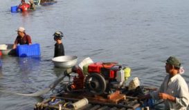 Anh Trịnh Thanh Phong, 42 tuổi ở thôn Tân an, xã Tri Hải, huyện Ninh Hải thu hoạch ốc hương bằng máy hút ốc .
