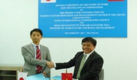 Ngày 20-12 tại thành phố Nha Trang (tỉnh Khánh Hòa), Cơ quan Hợp tác Quốc tế Nhật Bản (JICA) và Viện Nghiên cứu nuôi trồng thủy sản III thuộc Bộ Nông nghiệp và Phát triển Nông thôn đã ký kết Biên bản ghi nhớ về “Các hoạt động hợp tác sau khi hoàn thành Dự án xây dựng Trung tâm Nghiên cứu và Phát triển nuôi biển Nha Trang”.