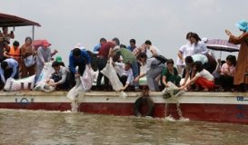 Đây là hành động của tất cả những cá nhân, tăng ni, phật tử hướng về trong buổi lễ phóng sinh, tái tạo nguồn lợi thủy sản tại bến sông phường Bồ Đề, quận Long Biên, TP Hà Nội nhân Ngày Lễ Phật đản 10/5/2017 (ngày 15/4 âm lịch).