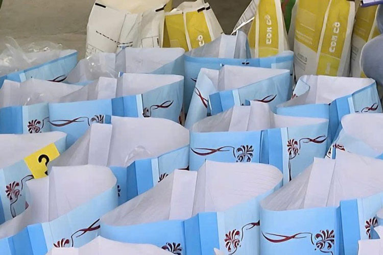 Các bao thức ăn tôm giả bị phát hiện. Ảnh: T.N