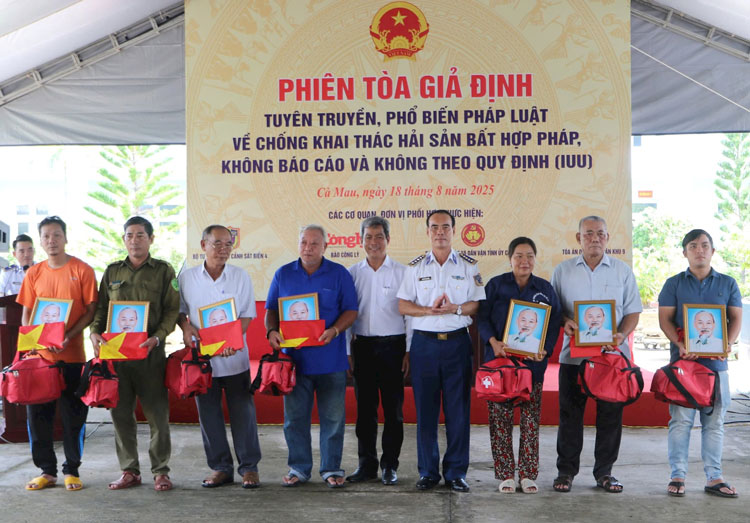 (TSVN) – Sáng 18/8/2025, tại Đồn Biên phòng Gành Hào (xã Gành Hào, tỉnh Cà Mau), Bộ Tư lệnh Vùng Cảnh sát biển 4 (BTL Vùng CSB4) phối hợp với Báo Công lý, Tòa án Quân sự Quân khu 9 tổ chức phiên tòa giả định nhằm tuyên truyền pháp luật về chống khai thác thủy sản IUU (bất hợp pháp, không báo cáo, không theo quy định).
