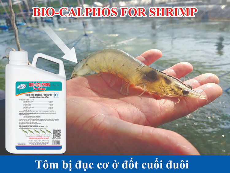 Trong trường hợp phát hiện tôm cong thân, đục cơ nhiều thì ngoài áp dụng những giải pháp trên, tiến hành trộn cho tôm ăn khoáng nước BIO-CALPHOS FOR SHRIMP liều 3 – 5 ml/kg thức ăn, cho ăn liên tục để bù đắp sự thiếu hụt các thành phần khoáng trong cơ thể tôm.