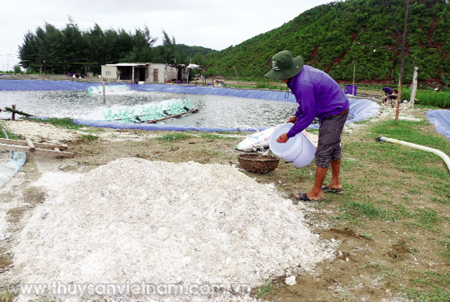 Bón vôi để điều chỉnh pH ao nuôi Ảnh: VM