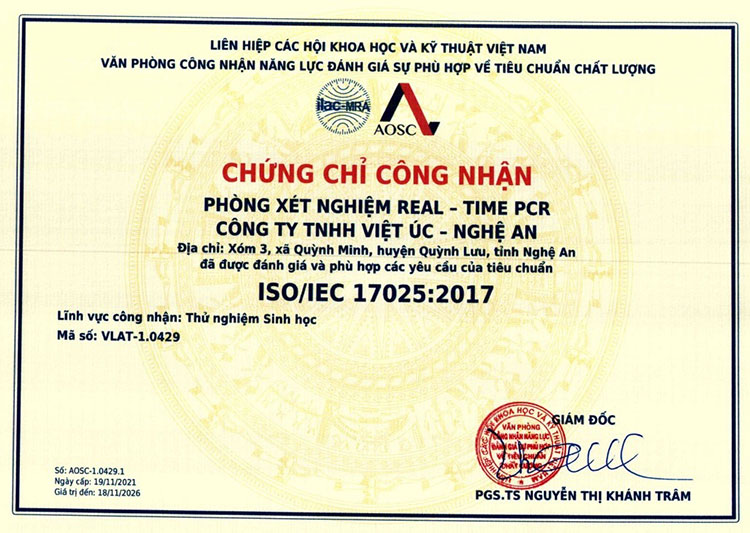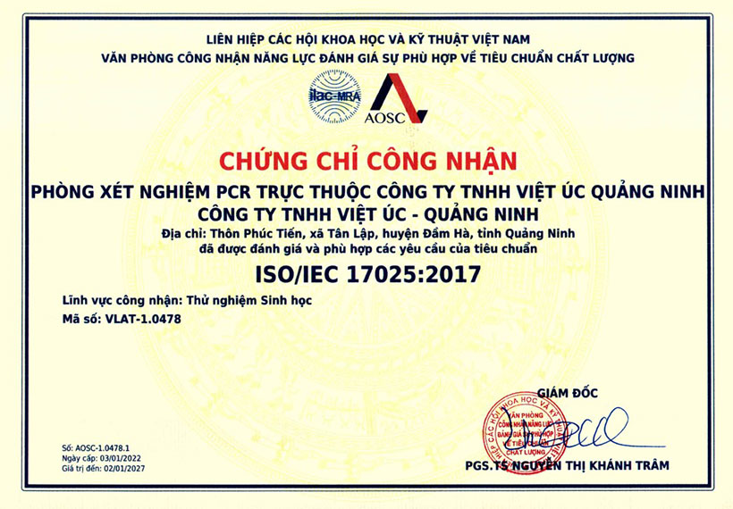 Ngày 3/01/2022, khu phức hợp sản xuất Tôm giống Công nghệ cao Việt Úc Quảng Ninh đã chính thức đạt chứng nhận ISO/IEC, 17025:2017 cho phòng xét nghiệm PCR. Và đây là khu phức hợp thứ 6 của tập đoàn Việt Úc đạt được chứng nhận danh giá này, bên cạnh Việt Úc Bạc Liêu, Việt Úc Nhà Mát, Việt Úc Nghệ An, Bình Thuận và Bình Định.