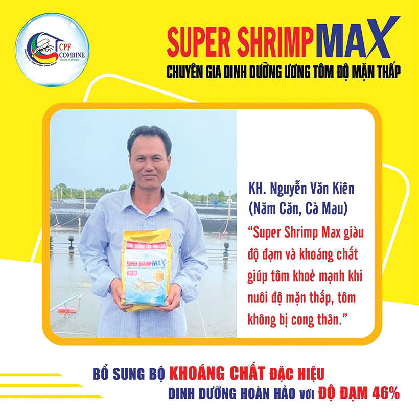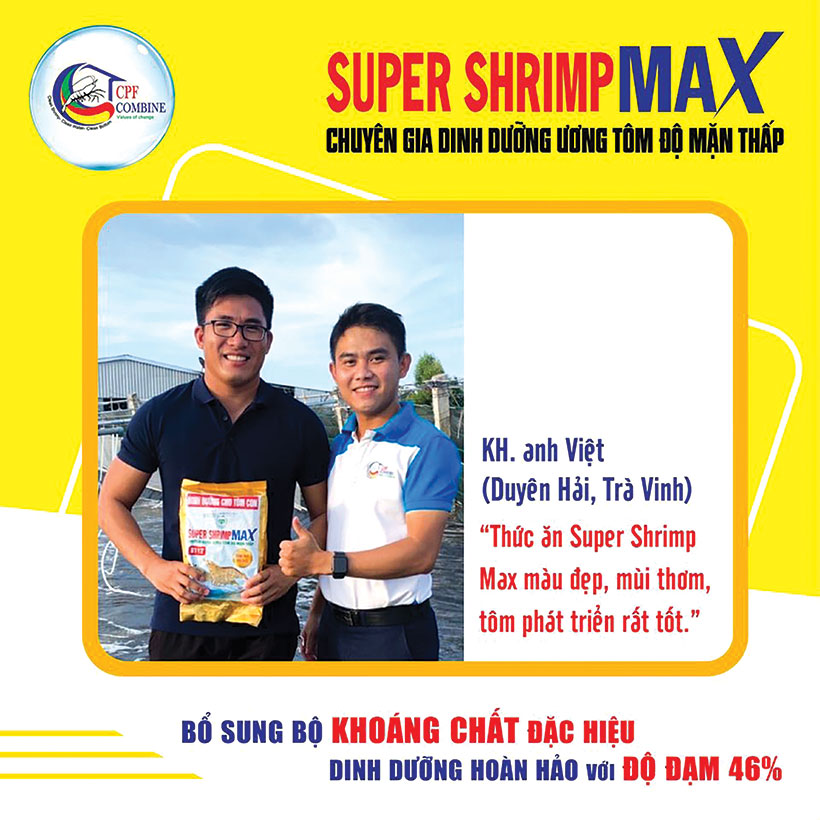 Còn chú Tiến, người nuôi tôm lâu năm tại Hương Mỹ, Bến Tre chia sẻ: “Giai đoạn ương rất quan trọng là nền tảng cho tôm phát triển suốt vụ nuôi, vì vậy khi thấy SUPER SHRIMP MAX có độ đạm và khoáng chất cao tôi đã sử dụng, sau thời gian quan sát thấy tôm khỏe mạnh và lớn nhanh vượt trội tôi rất an tâm”.