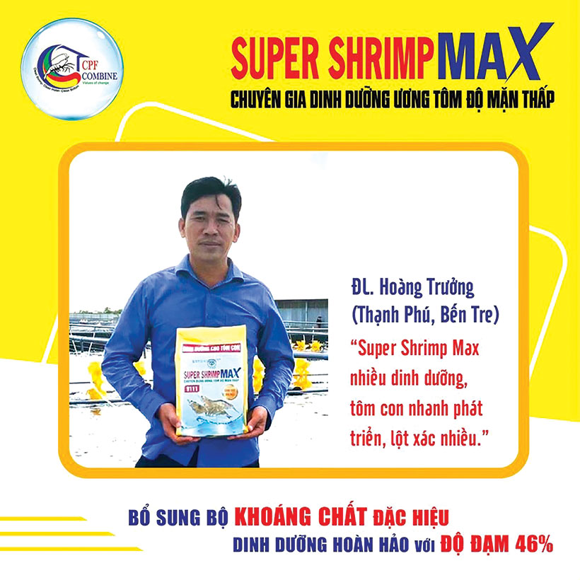 Anh Trần Minh Thắng tại Thạnh Phú, tỉnh Bến Tre cho hay: “Thấy nhiều bạn bè sử dụng, ương tôm vừa lớn nhanh vừa đạt đầu con tôi rất ấn tượng, vụ này tôi quyết chọn SUPER SHRIMP MAX cho các ao tôm của mình”.