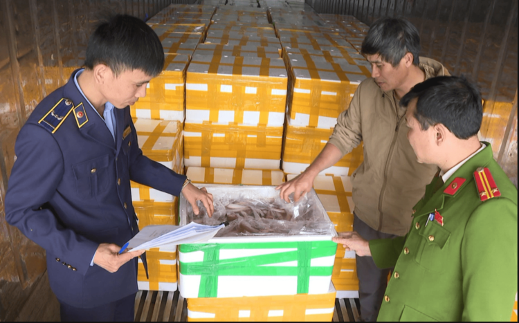 Lực lượng chức năng kiểm tra lô hàng cá khoai chứa chất cấm. Ảnh: Lam Sơn
