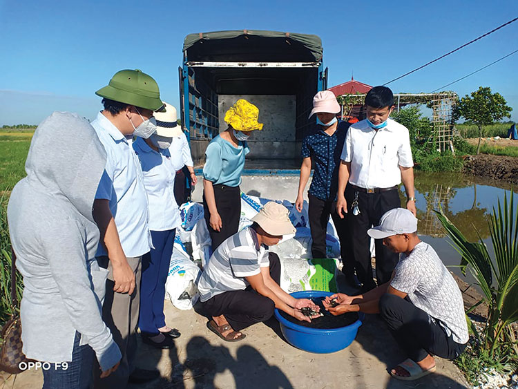 Các cán bộ của Trung tâm Khuyến nông Hải Phòng triển khai mô hình nuôi thủy sản cho hộ dân Ảnh: KNHP
