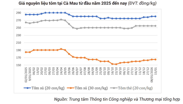 Còn tại Cà Mau, giá tôm nguyên liệu có xu hướng nhích lên. Trong những ngày giữa tháng 1/2026, tôm sú cỡ 20 con/kg đạt 280.000 đồng/kg và cỡ 30 con/kg đạt 165.000 đồng/kg, cùng tăng 5.000 đồng/kg so với cuối năm 2025. Riêng tôm thẻ cỡ 20 con/kg giữ ổn định ở mức 255.000 đồng/kg.