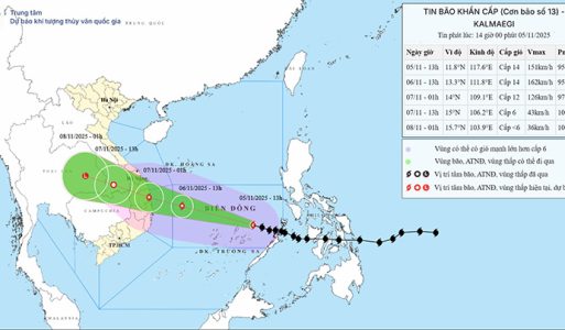 (TSVN) – Bão số 13 (Kalmaegi) đã mạnh lên cấp 13-14, giật cấp 17 ngay trên Biển Đông, cách đảo Song Tử Tây 360km. Đây là cơn bão rất mạnh, di chuyển nhanh (20-25km/h). Dự báo bão sẽ giữ cường độ cấp 14 trên biển và đổ bộ đất liền từ Quảng Ngãi đến Đắk Lắk.