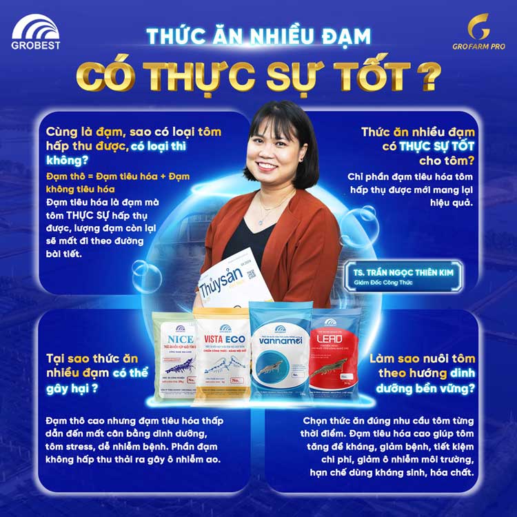 Tuy nhiên, hiệu quả không chỉ phụ thuộc vào hàm lượng đạm ghi trên bao bì, mà quan trọng hơn là khả năng hấp thu thực tế của tôm. Tôm chỉ hấp thu được phần đạm tiêu hóa, tức phần đạm thực sự có ích cho quá trình phát triển. Phần đạm dư thừa còn lại sẽ bị đào thải, vừa gây lãng phí, vừa làm ô nhiễm môi trường ao nuôi, tiềm ẩn nhiều rủi ro cho sức khỏe tôm.