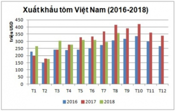 Kể từ đầu quý II đến tháng 8 năm nay, XK tôm vẫn trong xu hướng sụt giảm về giá trị so với cùng kỳ năm 2017. Cụ thể, trong tháng 7/2018, XK tôm giảm 20,3% so với cùng kỳ năm ngoái, do hầu hết các thị trường XK chính đều giảm mạnh.