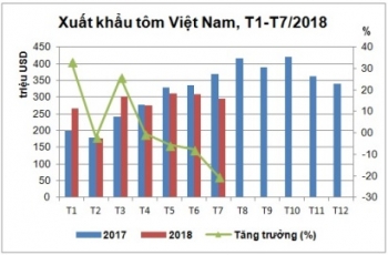 Sau khi giảm nhẹ 5% trong quý II/2018, XK tôm Việt Nam trong tháng đầu tiên của quý III đã giảm tới 20,3% chỉ đạt 294,5 triệu USD. 7 tháng đầu năm nay, XK tôm đạt 1,9 tỷ USD, tăng nhẹ 0,2% so với cùng kỳ năm ngoái. Như vậy, tốc độ tăng trưởng XK tôm tính đến tháng 7/2018 đã chững lại trong bối cảnh xuất hiện một số yếu tố không thuận lợi cho XK từ giá tôm nguyên liệu tới nhu cầu thị trường NK.